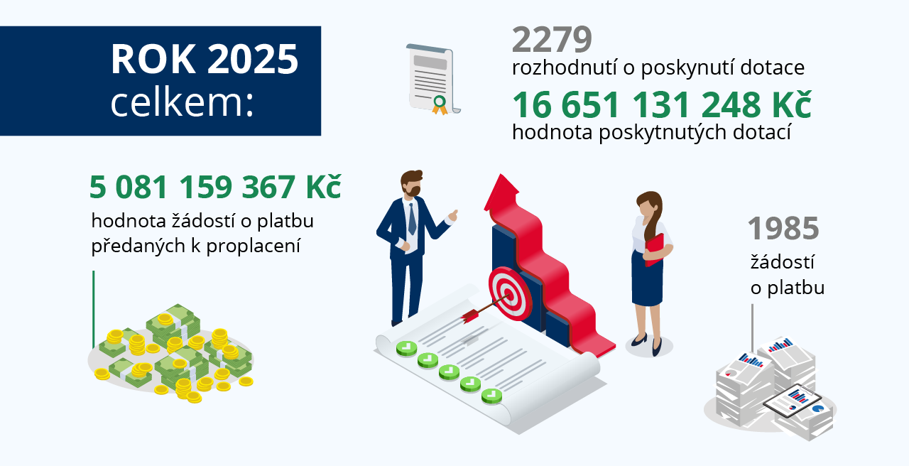 Celkově bylo v dotačních výzvách OP TAK v roce 2025 vydáno 2 279 právních aktů v celkové výši požadované dotace 16 651 131 248 korun. V API jsme zpracovali a předali k proplacení 1 985 žádostí o platbu v celkové výši 5 081 159 367 korun. Na účty příjemců bylo na základě 1 938 žádostí o platbu odesláno celkem 4 878 825 306 korun.